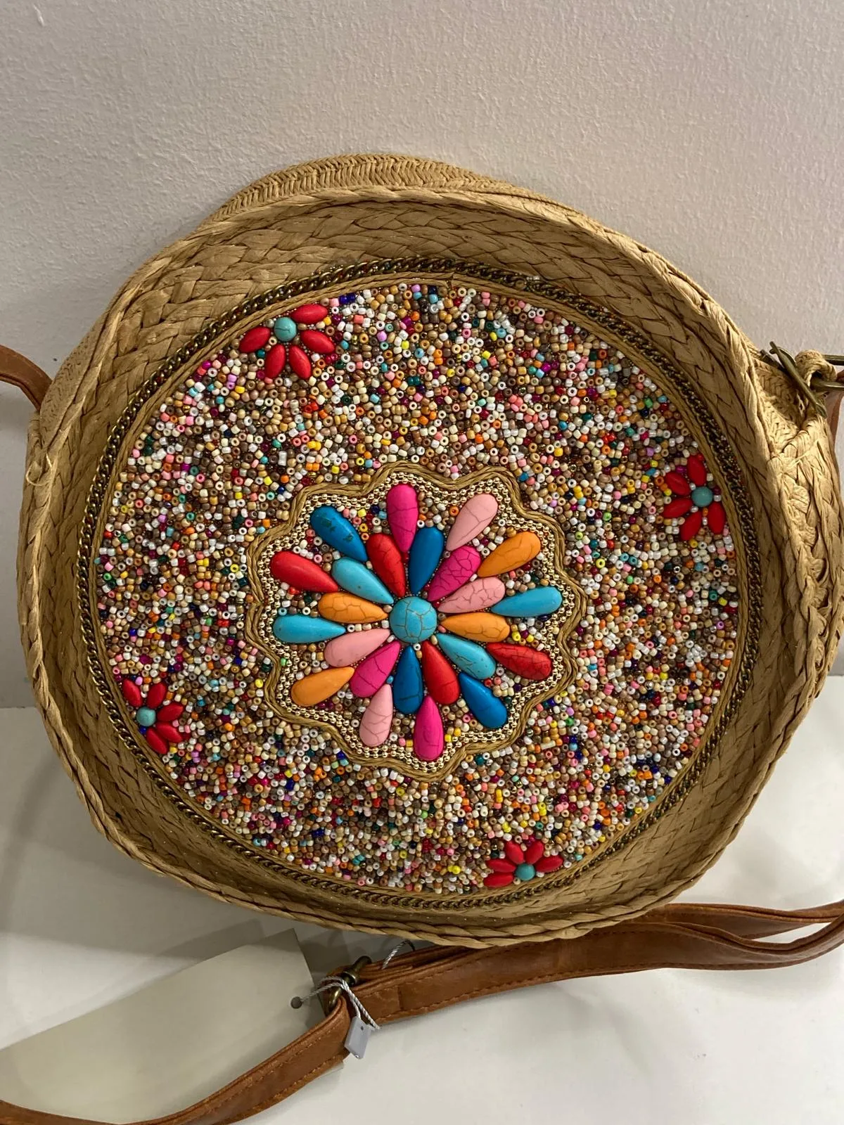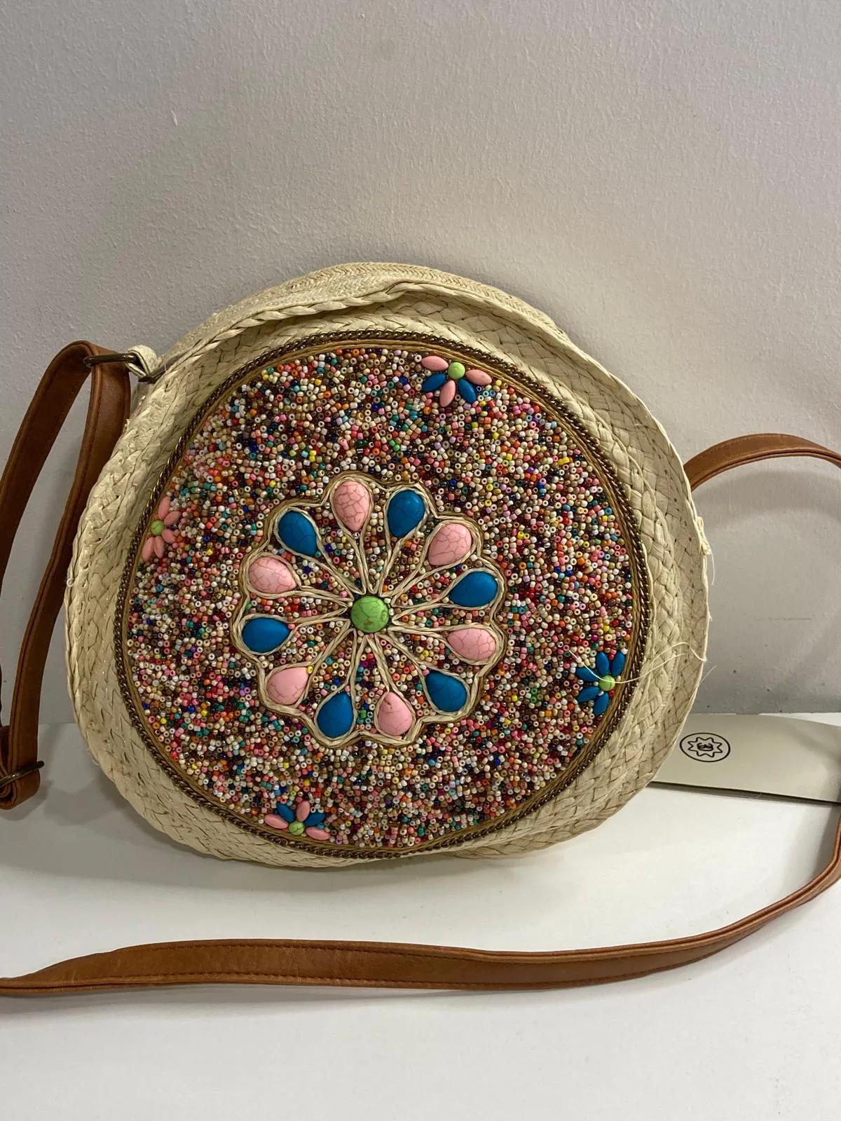 Un diseño geométrico que rompe esquemas. Este bolso redondo destaca por su mosaico de piedras de colores en el centro, creando un foco de luz y alegría en cada movimiento.