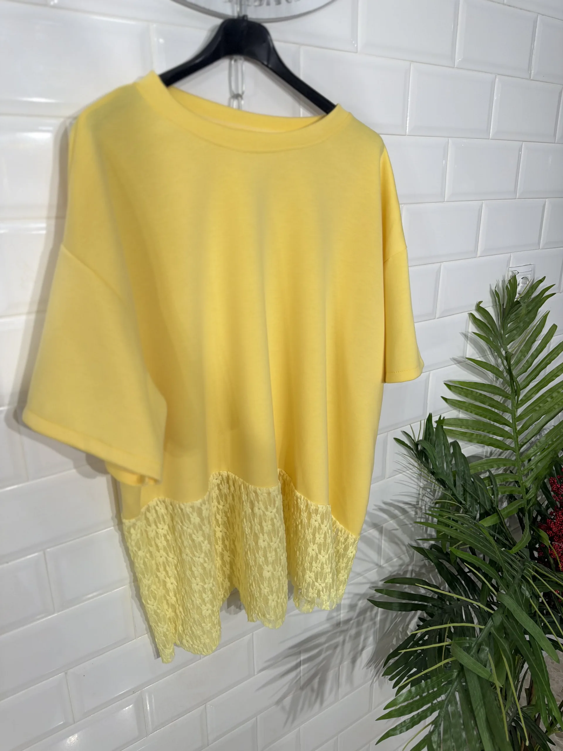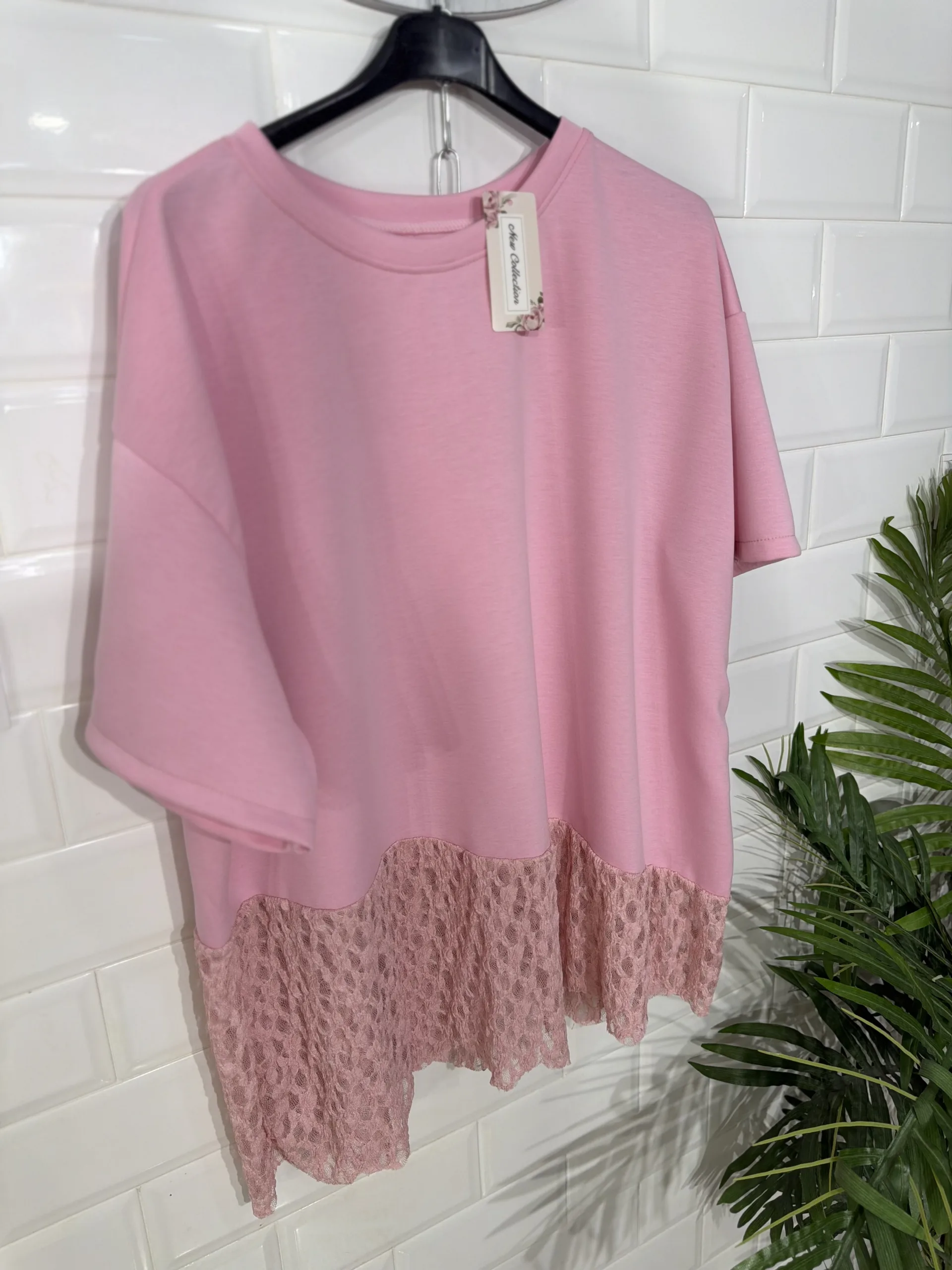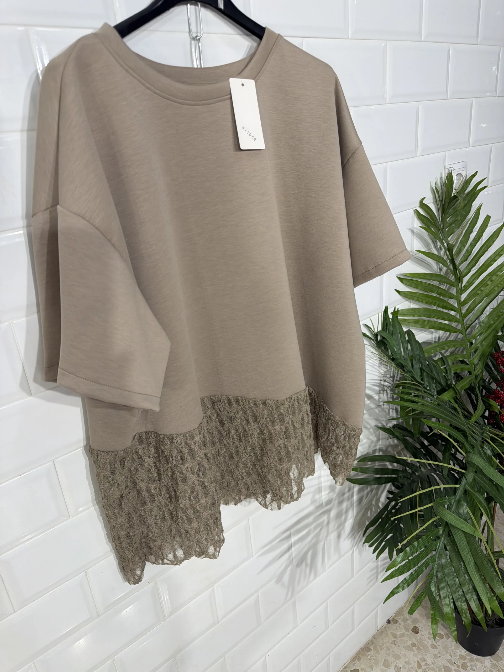 Siente la delicadeza del encaje sobre la suavidad del punto Roma, una camiseta que combina elegancia y confort en cada detalle”.