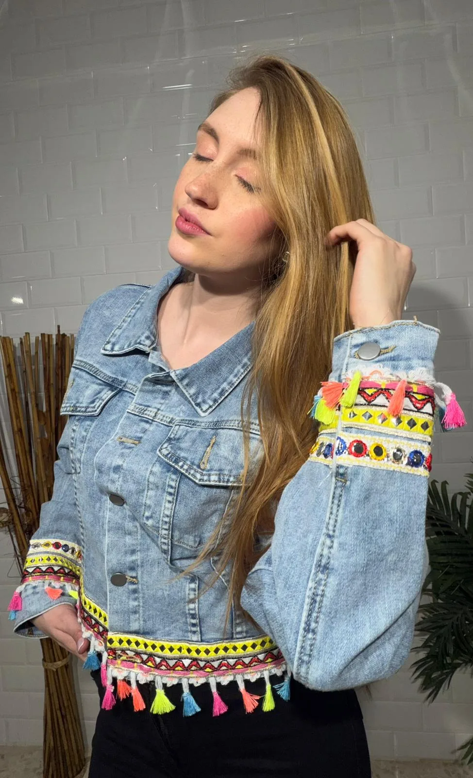 Es una chaqueta vaquera clásica, en su tono azul original, pero decorada con pompones multicolores, que le dan un toque divertido y vibrante a un estilo clásico.