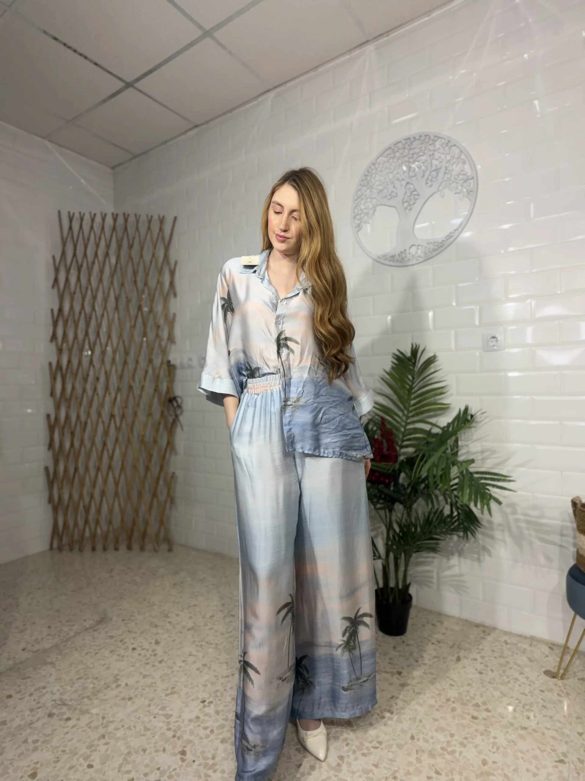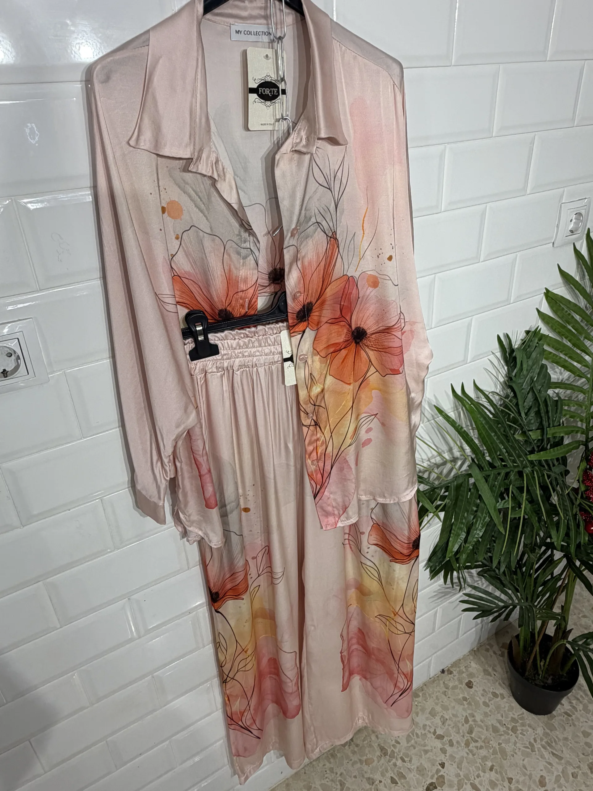 “Este conjunto de satén, compuesto por una blusa de botones delicados y un pantalón a juego, envuelve la silueta con un brillo sutil y un toque sofisticado, ideal para una ocasión especial.”