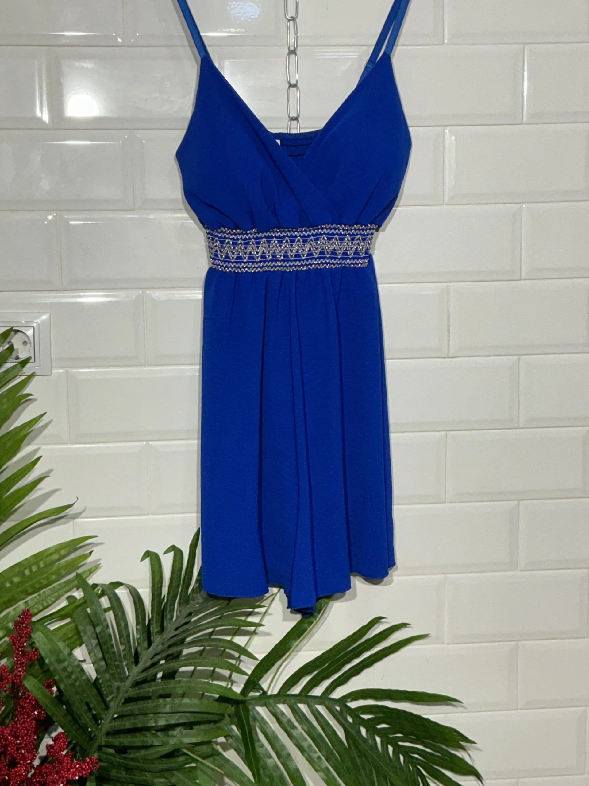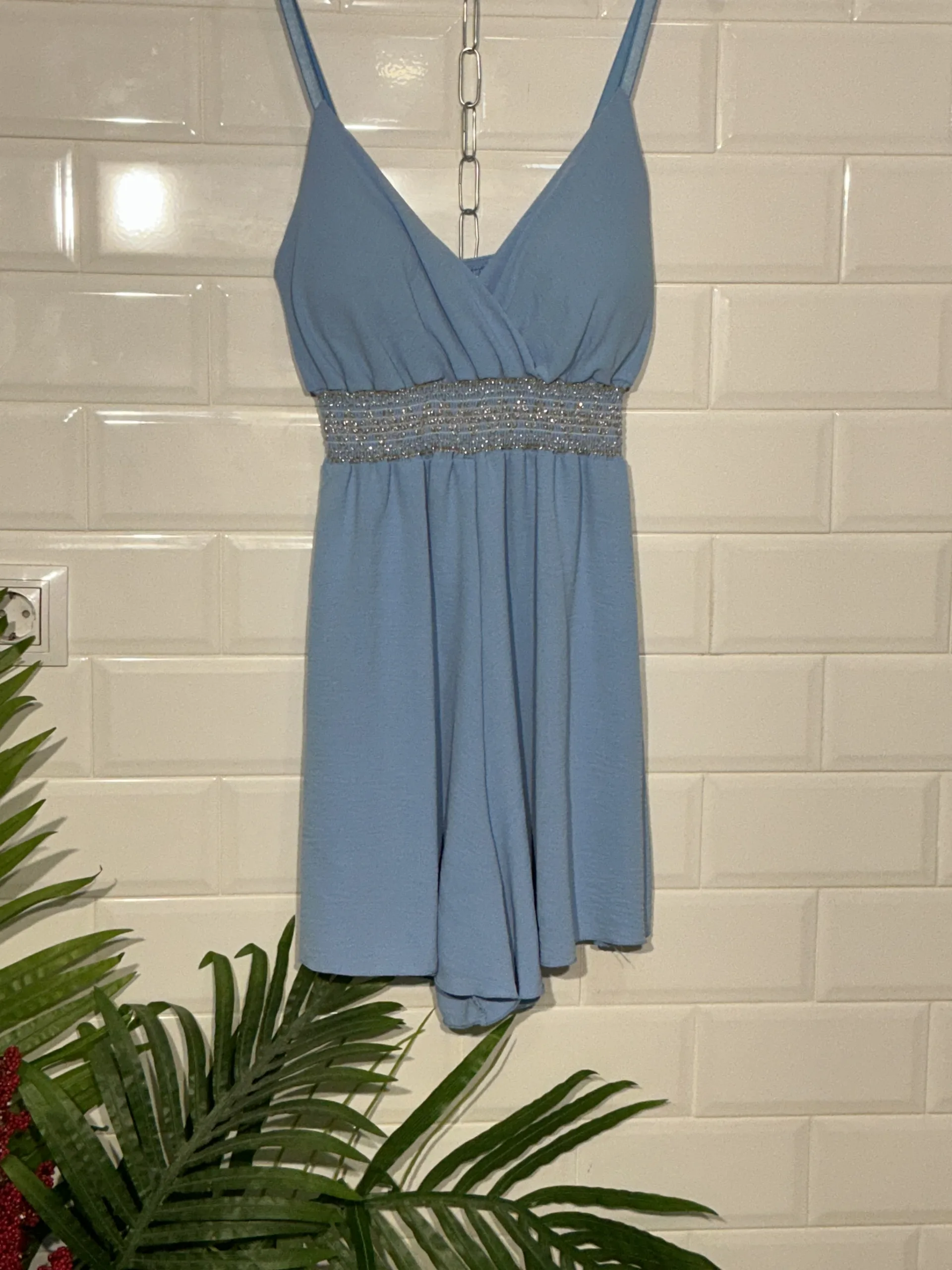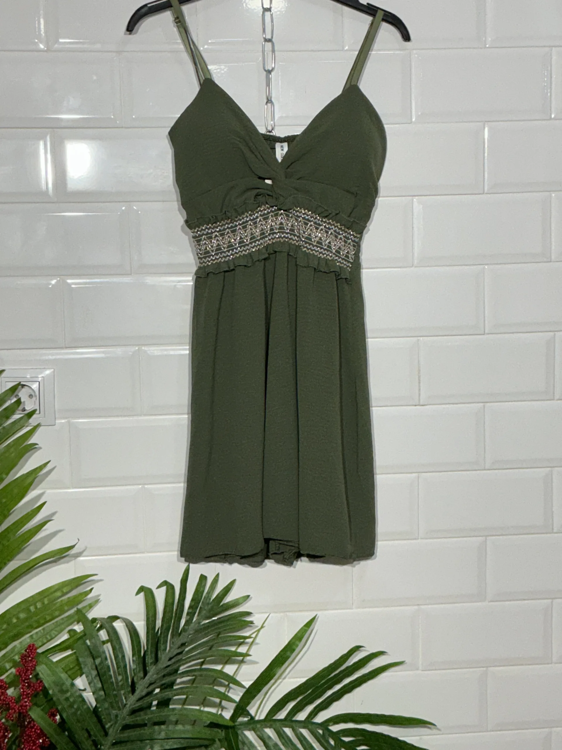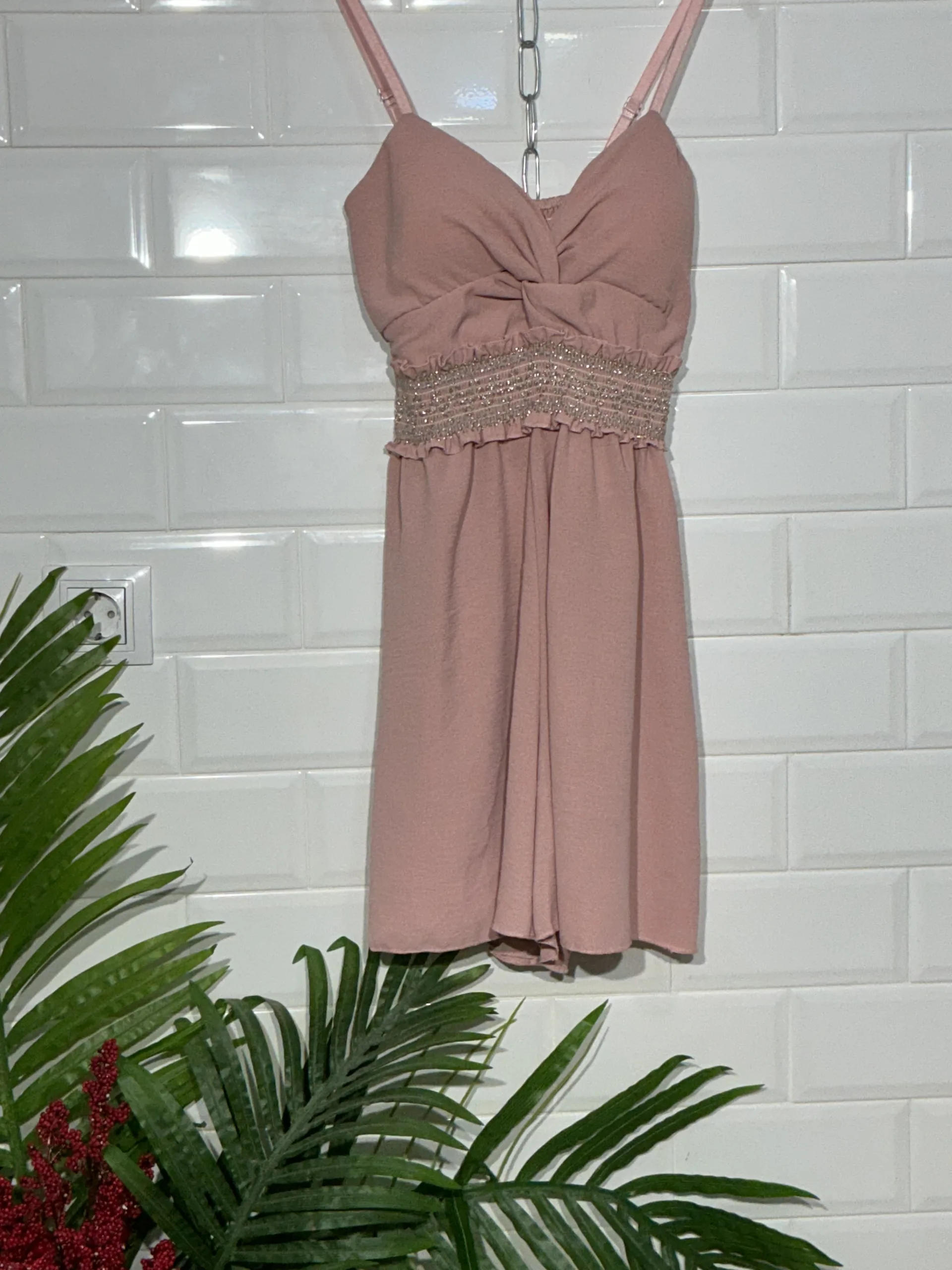 ¡Claro! Este mono corto lleva tirantes y con cascos en el pecho, una cinturilla ancha y elástica que define la figura, y un corte fresco y cómodo, perfecto para cualquier ocasión.