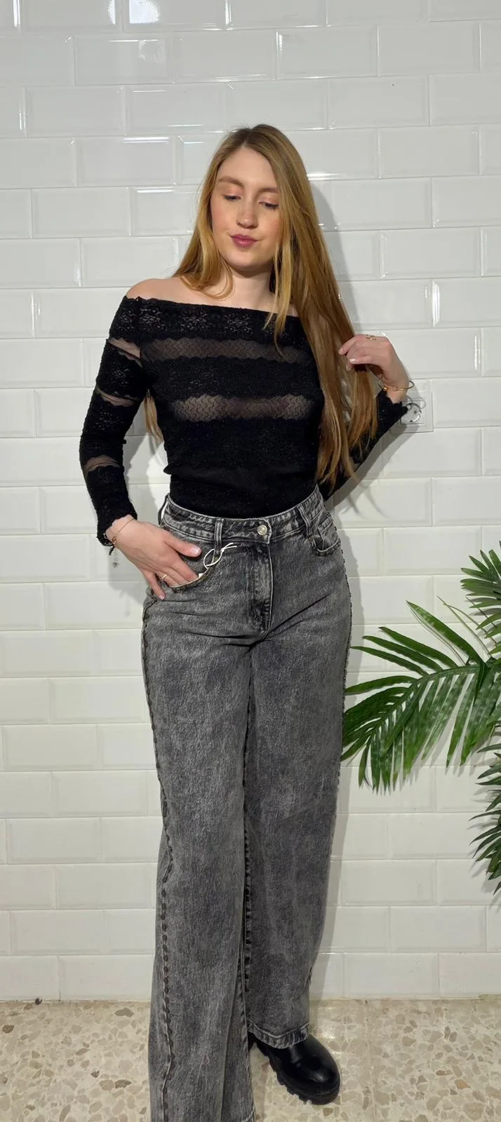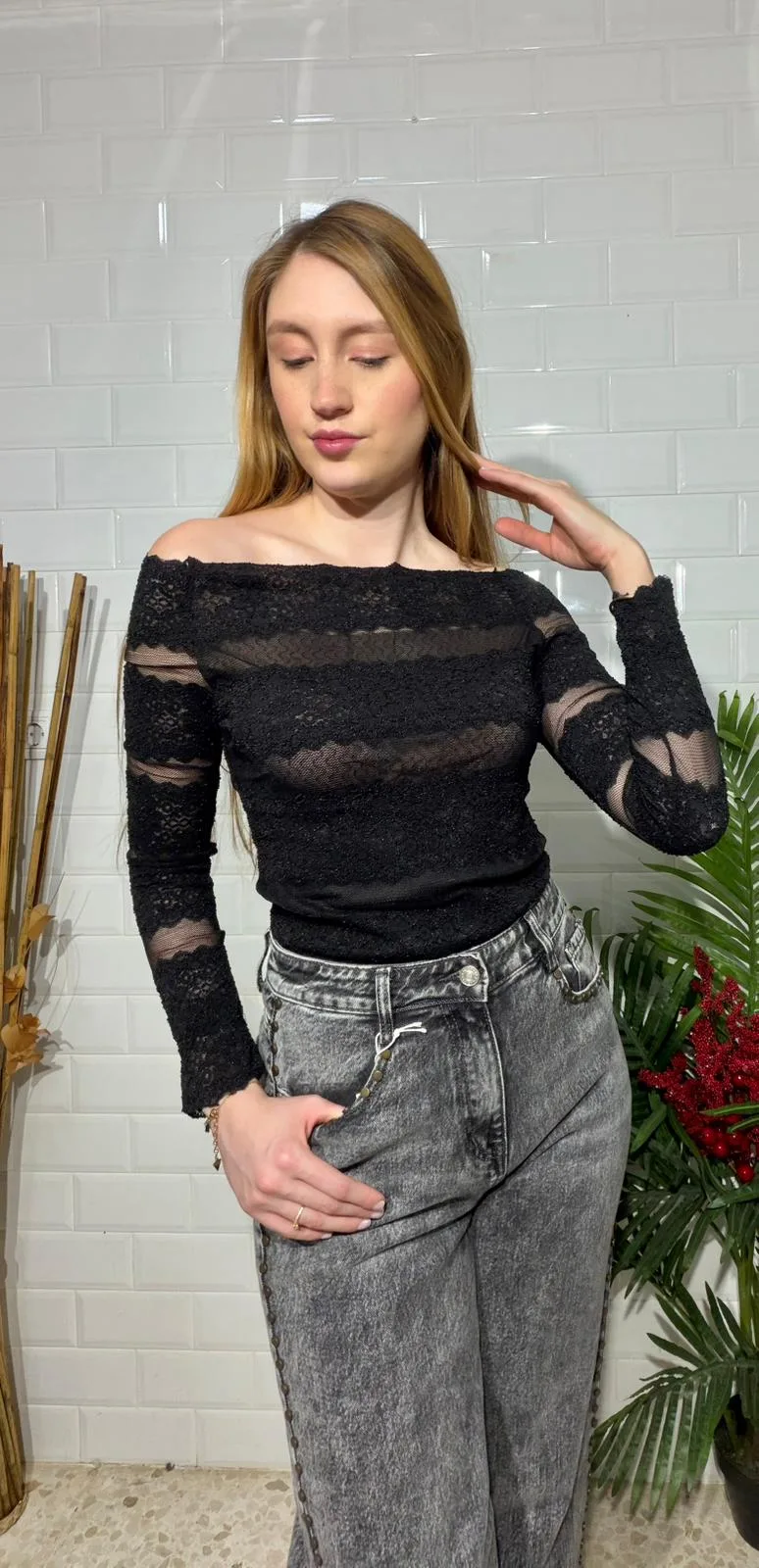 “Este top de encaje y tul, de mangas largas y ajuste perfecto, envuelve tu silueta en un delicado juego de transparencias, combinando elegancia atemporal con un toque moderno, ideal para brillar en cualquier ocasión.”